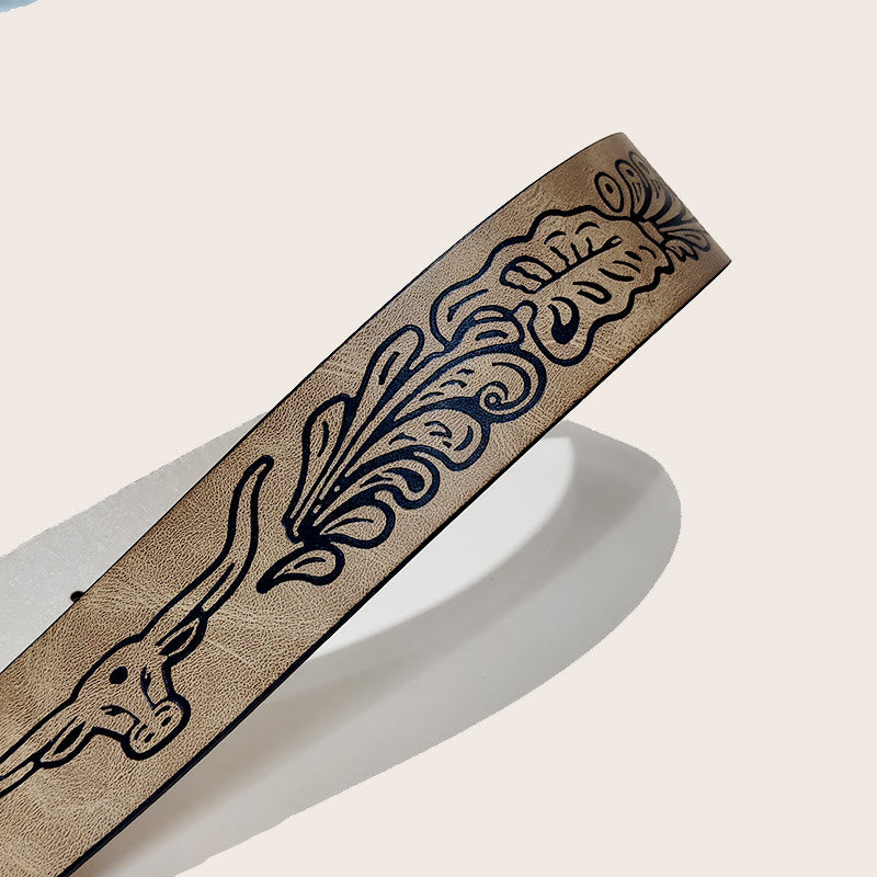 - The surface of this belt is engraved with black patterns, giving it a vintage feel. The buckle is shaped like a bull skull, with exquisite details and full of Western elements.