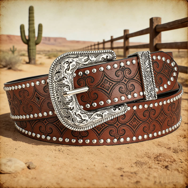 • This western-styled belt is crafted from soft and durable leather, highlighted by an elaborate carved decorative buckle and rivet detailing that brings distinctive rugged retro charm.