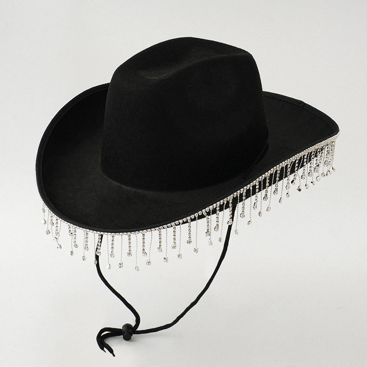- This isn't your ordinary cowboy hat. The sleek silhouette is adorned with elegant tassels that swing with every move and lustrous pearls that add a touch of refined rebellion.