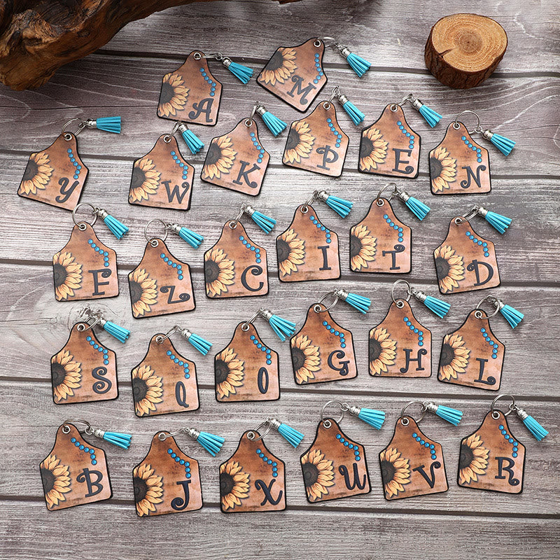 Western Style Sunflower&Letter Tassel Leather Keychain