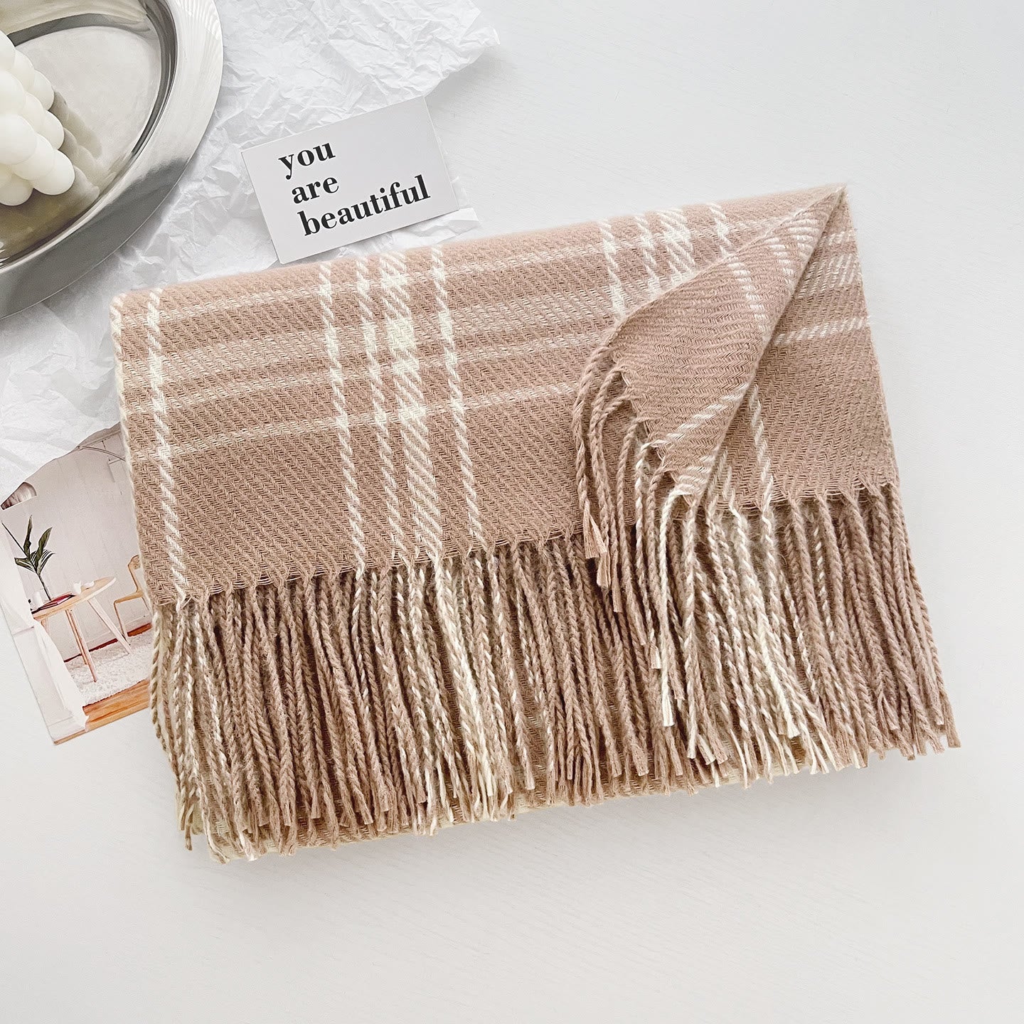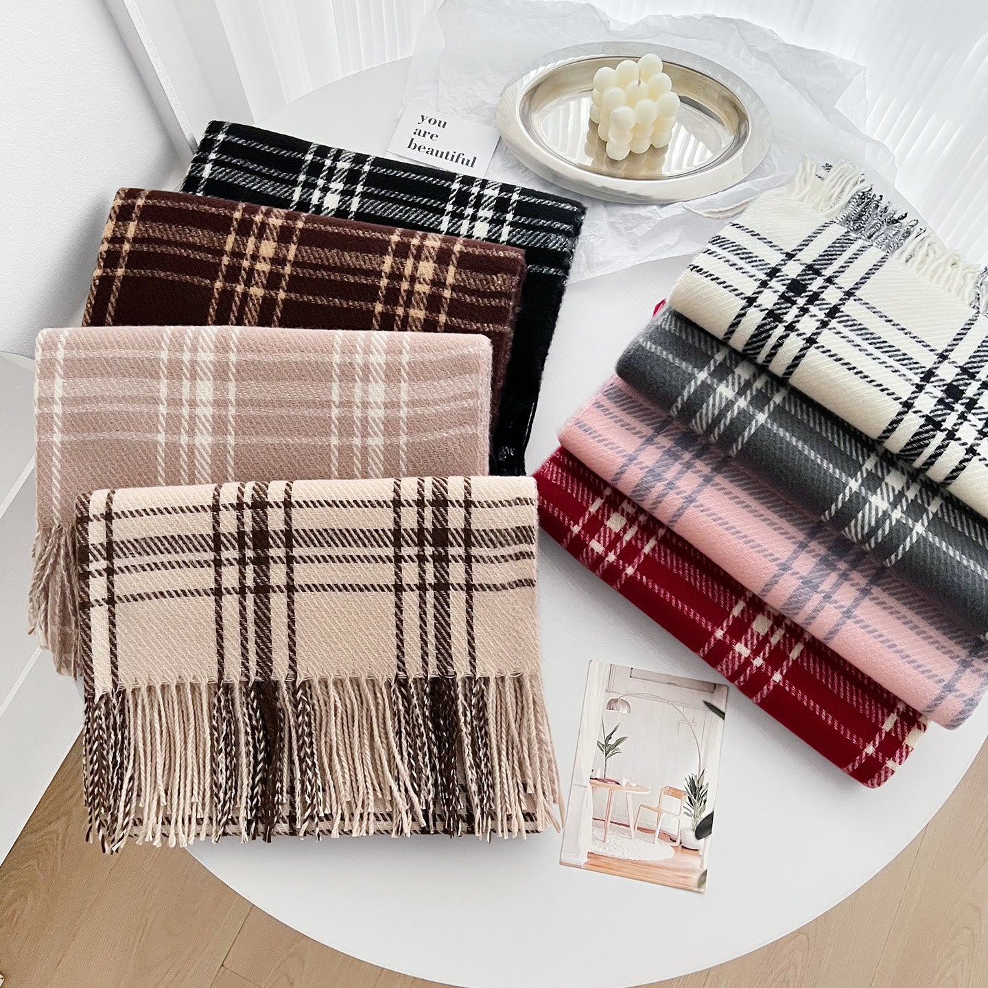 - This scarf features a plaid and tassel decoration design, with a length of approximately 200CM, and supports various wrap styles;