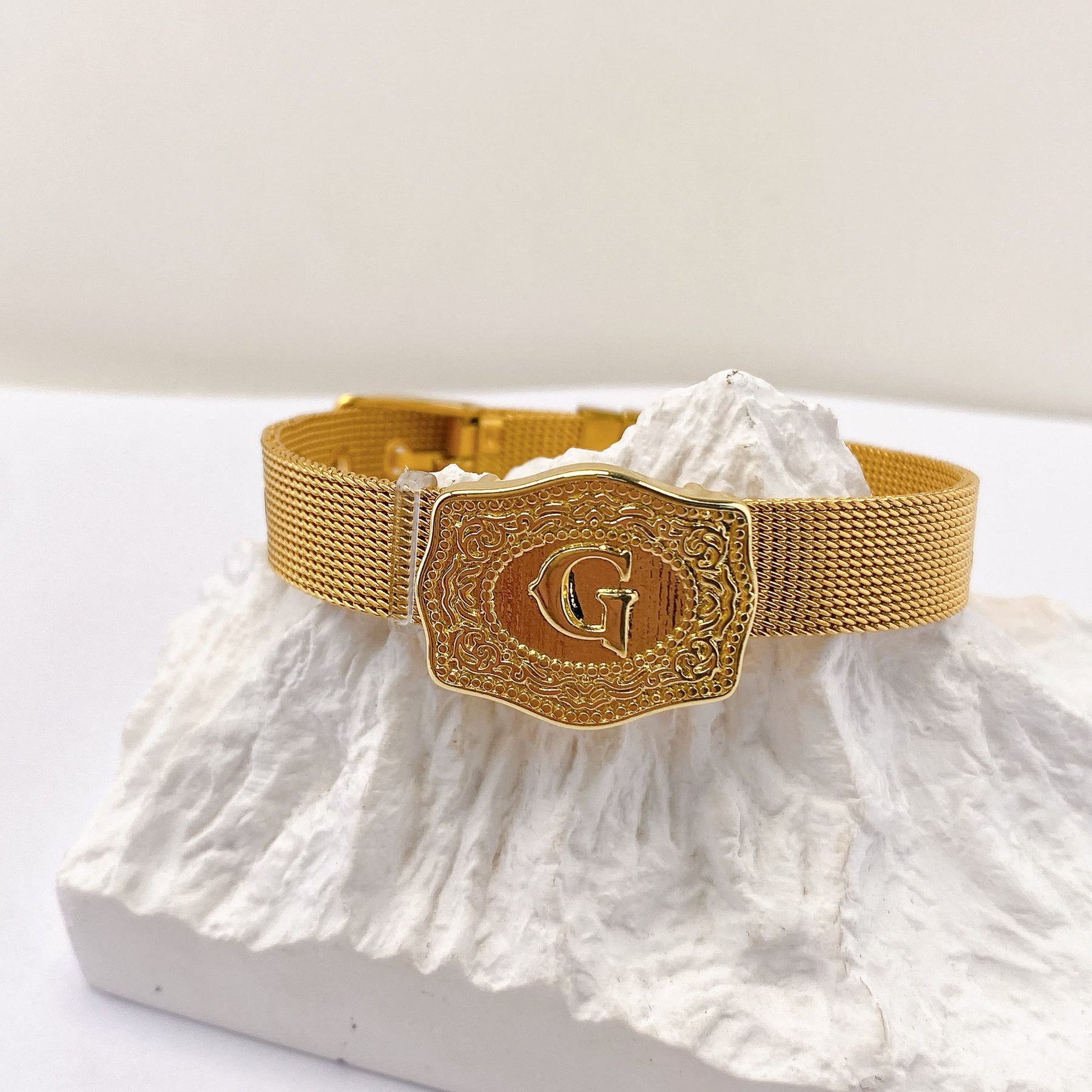 Glamorous Gold Tone Engraved Initial Letter Bracelet