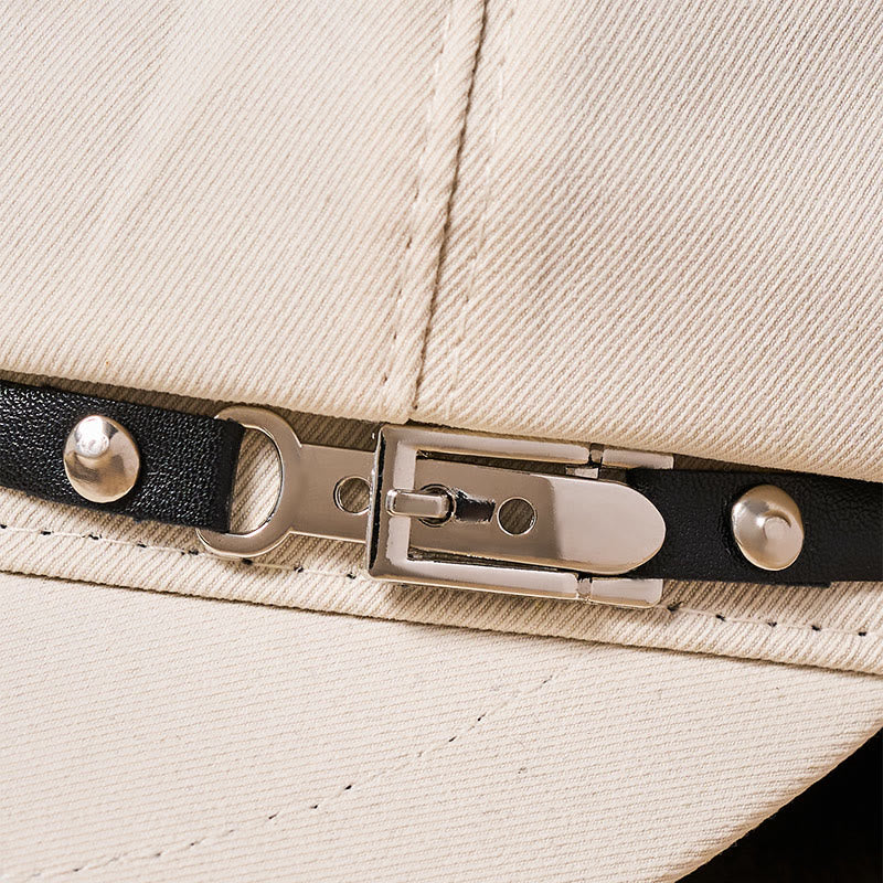 • This beret is made of soft and crisp fabric, with a gentle and versatile beige color tone. The body of the hat is embellished with diamond studded galloping metal badges, adding a luxurious and exquisite feeling. The black leather decorative strip at the brim, combined with metal buckle details, further enhances the retro tough style;