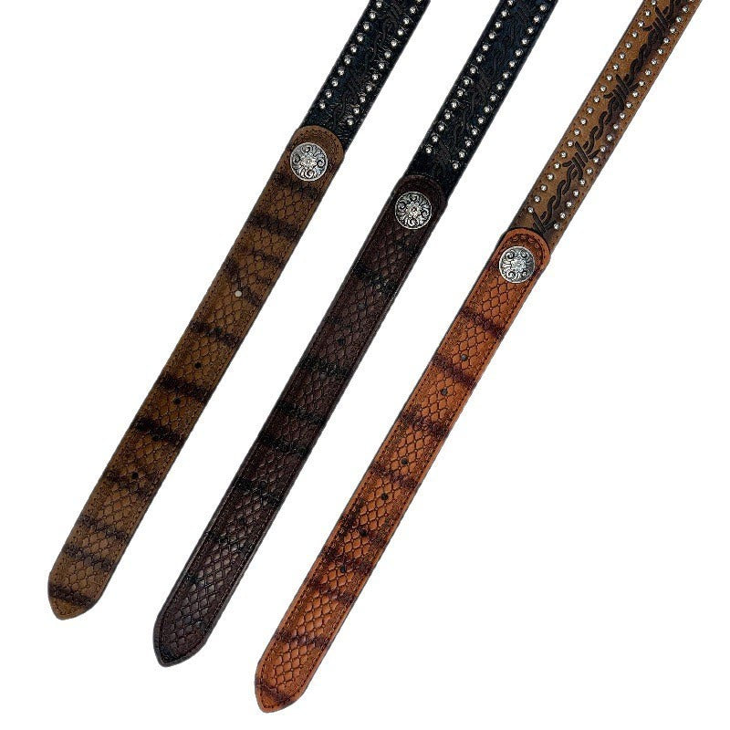 - This belt is made of snake patterned fabric, with a unique texture and a wild atmosphere; The side is decorated with rivets and paired with vintage patterned vintage silver needle buckles;