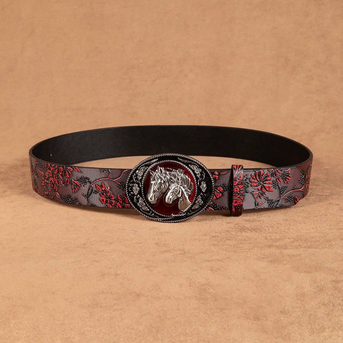 - The buckle is made of antique silver double horse head relief, paired with a red background and patterned border. The details are full and the style is unique, retaining the wildness of western elements while adding a romantic and exquisite tone;